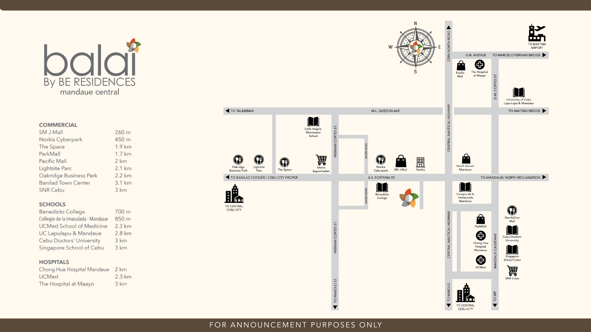 1. SM City JMall – 500 m 2. J Centre Mall – 1 km 3. Parkmall / Ayala Central Bloc – 3 km 4. Mandaue Business Hubs / BPO Centers – 4–5 km 5. Cebu IT Park and Cebu Business Park – 6–7 km 6. Schools and Universities – 1–3 km (depending on the institution) 7. Hospitals and Wellness Centers – ~2–4 km 8. Key Transport Routes (A.S. Fortuna) – adjacent / immediate access